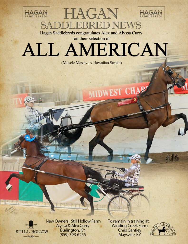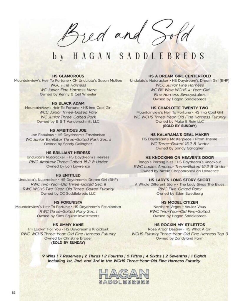 Hagan Saddlebreds congratulates Barbara Goodman Manilow on the selection of HS Ambitious Joe (Joe Fabulous x WC HS Daydream’s Fashionista by Undulata’s Nutcracker and out of A Daydream Believer (BHF))! We wish you and receiving trainer, Skyline Stables, the very best! Horses of this caliber are always available at Hagan Saddlebreds.
