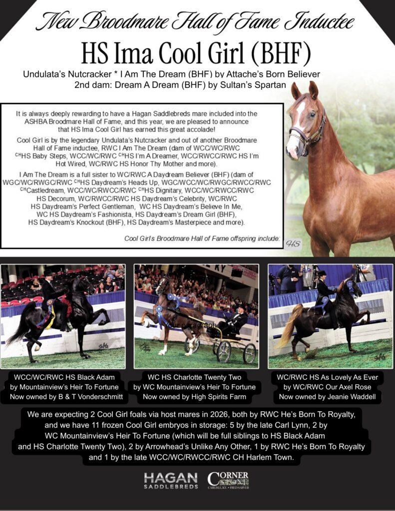 His first foals out of mares such as WC producer Daphne Dearest, WC producer Positively Peggy and multiple RWC producer HS Daydream’s Dream Girl are just now entering training. Only seven years old, the sky is the limit for the aptly named HS Daydream’s Masterpiece. He is truly the culmination of the Hagan Saddlebreds breeding program and is poised to make his mark in the breeding shed. He is offered through private treaty – Contact Fred Sarver at Cornerstone – (859) 953-0265